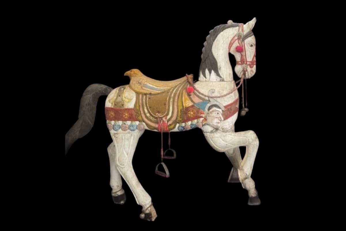 Carved entirely from wood over 150 years ago, this life-sized horse plays a central role in the Bun Bang Fai (Rocket Festival) of northeastern Thailand. Traditionally, a young unmarried woman and a man ride the horse in a lively village parade, accompanied by music, dance, and celebrations to invite rain and fertility for the crops. The detailed carving and bright decorations reflect the blending of local craftsmanship with deep cultural symbolism. Today, it stands as a rare surviving example of Isaan’s vibrant festival heritage.