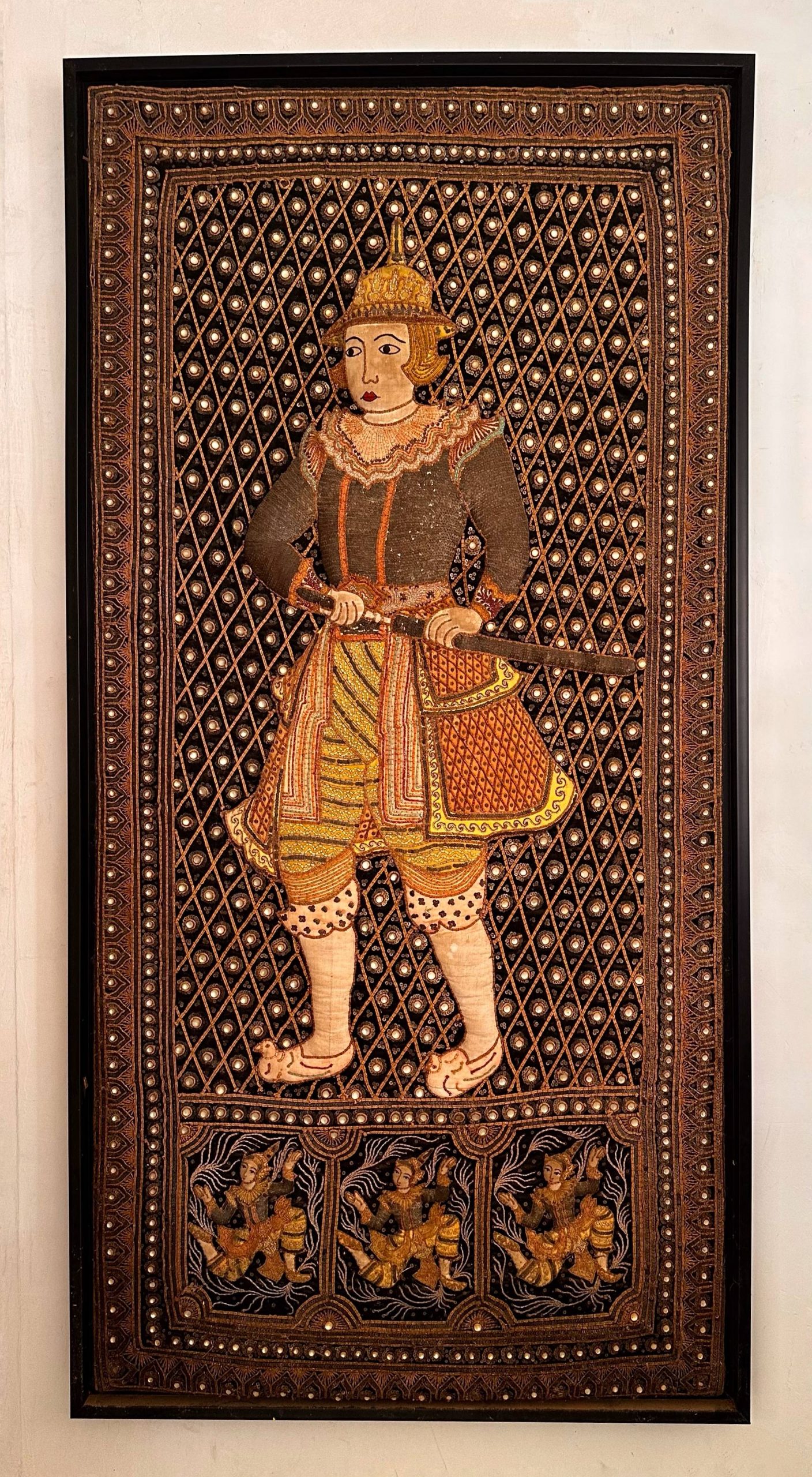 This rare large-format textile is executed in the Kalanga technique, a highly decorative embroidery style introduced to Mandalay after the fall of Ayutthaya. Captured Siamese artisans brought new skills, including the use of imported British glass beads, which became integrated into Burmese court art. The motif depicts the King’s general, as seen in 19th-century illustrations, wearing ceremonial armor and holding a sword in readiness. Rich in symbolic detail, the work reflects both the grandeur of the Burmese court and the layered cultural influences that shaped it.